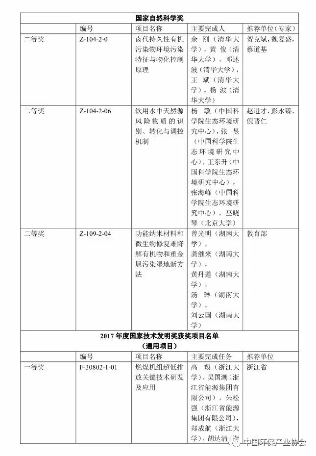环境领域全部的国家科学技术奖,共有17项,包括3项国家自然科学奖、5项国家技术发明奖和9项国家科技进步奖,涉及水污染控制、废气处理、土壤修复、固废处理、清洁生产等多个分领域。其中浙江大学和浙能集团研制的“燃煤机组超低排放关键技术研发及应用”获得此次国家技术发明奖一等奖。