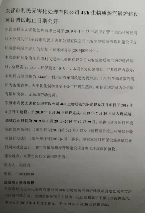 东营市利民无害化处理有限公司4t/h生物质蒸汽锅炉建设项目调试起止日期公开
